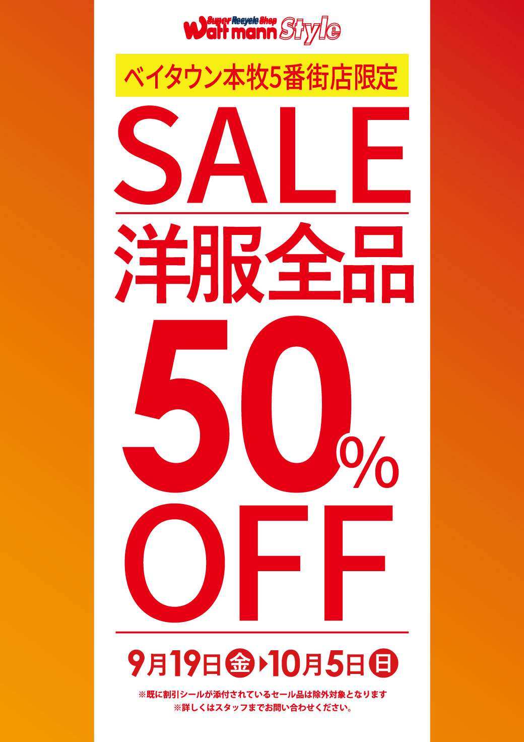 【ベイタウン本牧5番街店 限定セール】9/19~ 洋服 50%OFF