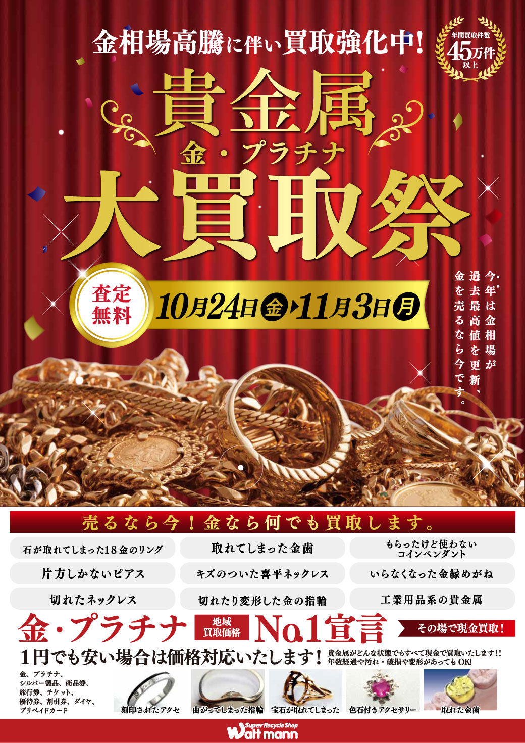 現在、ワットマン全店で金・プラチナの大買取祭を開催中!